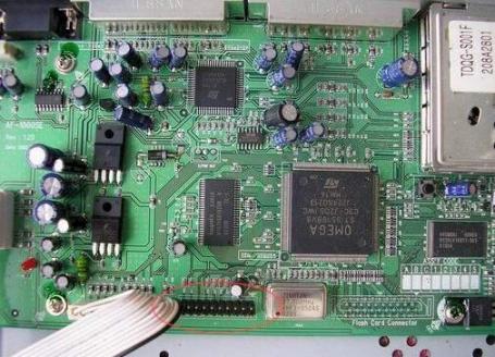 Снимаем верхнюю крышку ресивера, и увидим в передней части большой печатной платы рядом с разъёмом подключения дисплея видим контактные площадки для разъёма Jtag, к которым паяем соответствующие проводники от платы jtag интерфейса (обведено красным цветом).