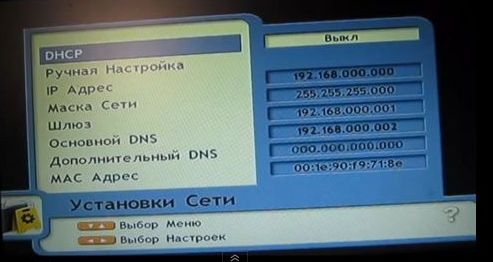 При использовании функции кардшаринга через разъем Ethernet (Lan) ресивера, потребуется подключить его сетевым кабелем к роутеру или ADSL модему со встроенным роутером. Причем роутер должен быть настроен на самостоятельный выход в Интернет. Необходимо нажать "Меню"-> "Установка"-> "Установки сети". Мы рекомендуем пункт DHCP включить для автоматической настройки сети, иначе вручную прописать IP адрес и шлюз и DNS адреса.