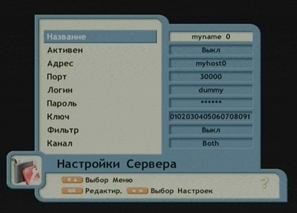 Все необходимые настройки кардшаринга вносим в разделе "Меню" с помощью комбинации кнопок 1113. В появившемся разделе "Список серверов" выбираем любой сервер и жмем красную кнопку для внесения изменений.